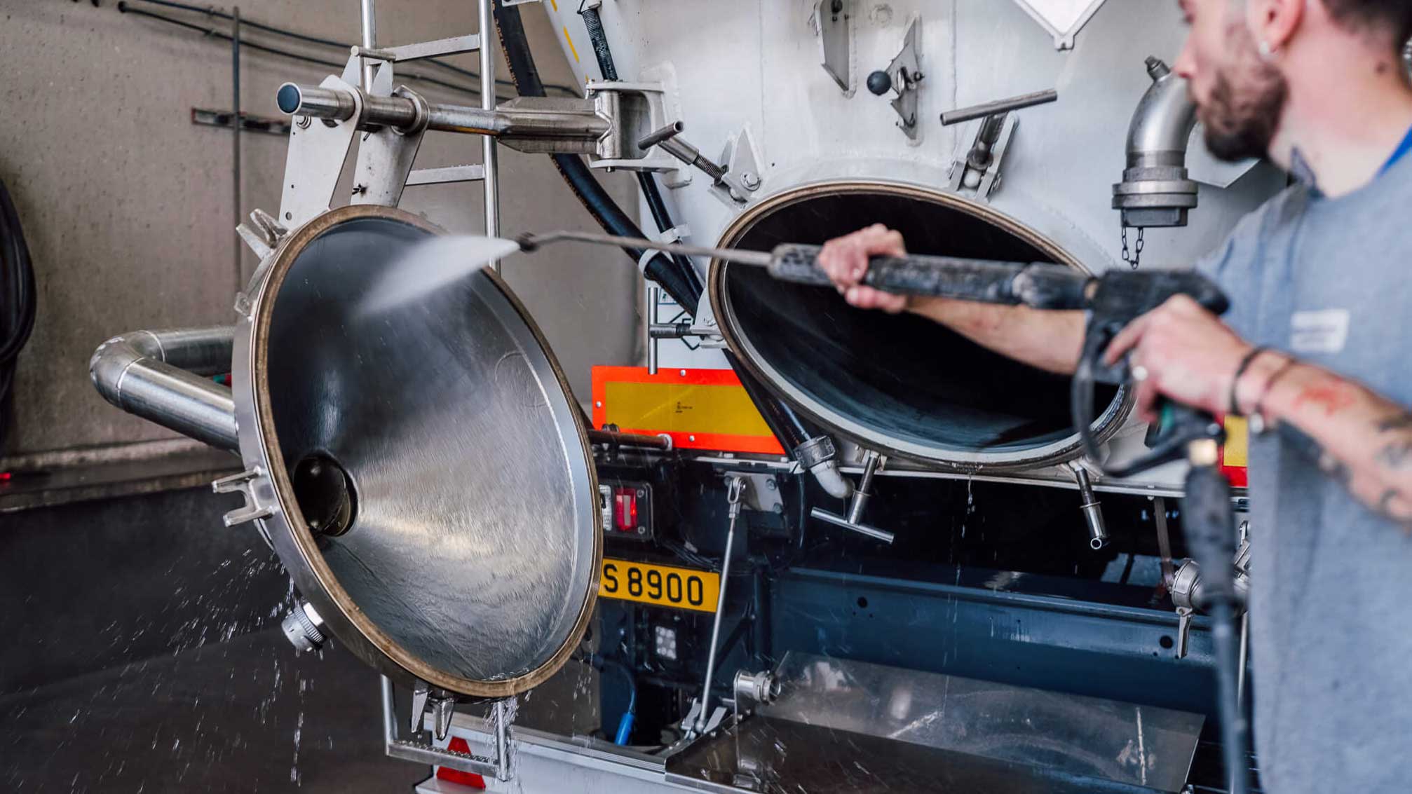 Zuerst werden Türen, Luken und Außenteile des Silos von Hand gründlich abgespritzt, um grobe Verschmutzungen zu entferne